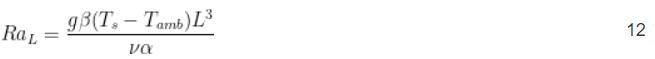 Конвективное термическое сопротивление — это степень отвода тепла от поверхности пластины за счет движения воздуха. Для нагретой вертикальной пластины с естественной конвекцией безразмерное число Нуссельта (Nu) [2] получается из уравнения 11. Число Нуссельта — это безразмерная переменная, используемая в расчетах конвекции.