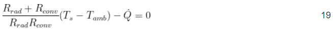 Значения R рад , R конв и R sp не могут быть решены напрямую, поскольку они являются функцией температуры поверхности пластины T s . Если предположить, что все тепло, выделяемое источником тепла, рассеивается плоским радиатором, уравнением энергетического баланса будет уравнение 19.